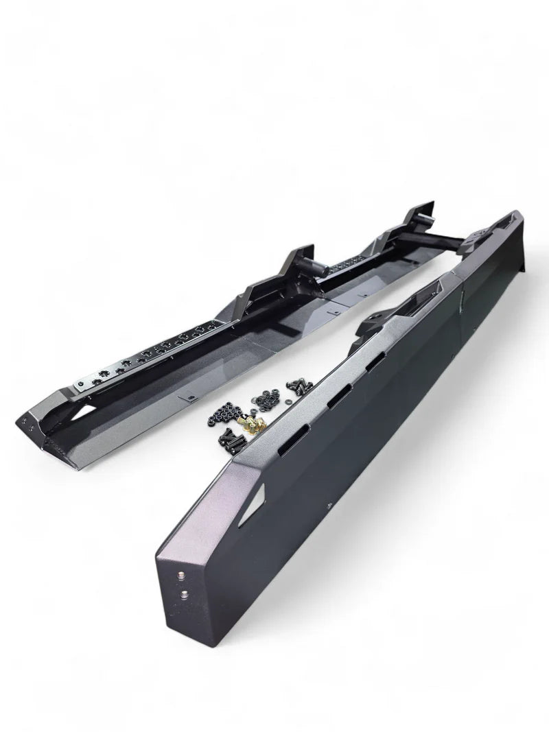 The Elektric Offroad Designs Volt Series 2016+ Can-am Defender Volt Rocker Steps provides added protection to your side by side. Our sliders give added protection to the Defender's body when squeezing through tight places on your run. Our built-in step function with grip plating allows for traction. These steel sliders are finished in a hammer black powder coat and the aluminum accent plates are finished in a satin black powder coat. Installation features a simple bolt-on process.