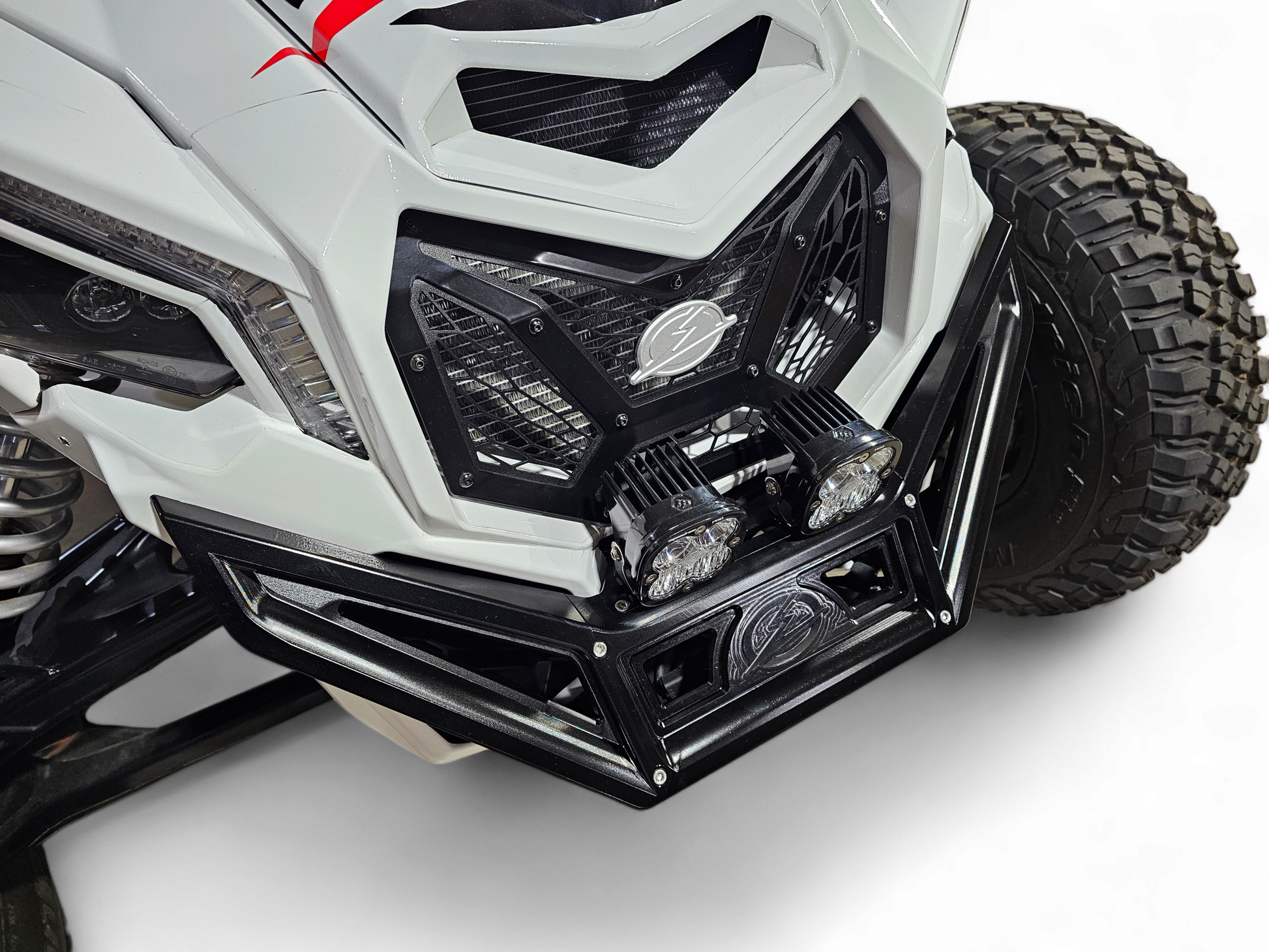 Our lightweight machined billet aluminum 2017 to current Can-Am X3 Maverick Winch Front Bumper features provisions for accessories and offers your ride improved protection and styling. Central to our bumper is a hidden steel winch mount that attaches to the frame for secure recovery options. It includes 2 mounting options for cube lights or round lights and channels for clean wire management. Constructed from lightweight billet aluminum, our Can-Am X3 Maverick Front Bumper is anodized black and features a fully bolt-on installation.