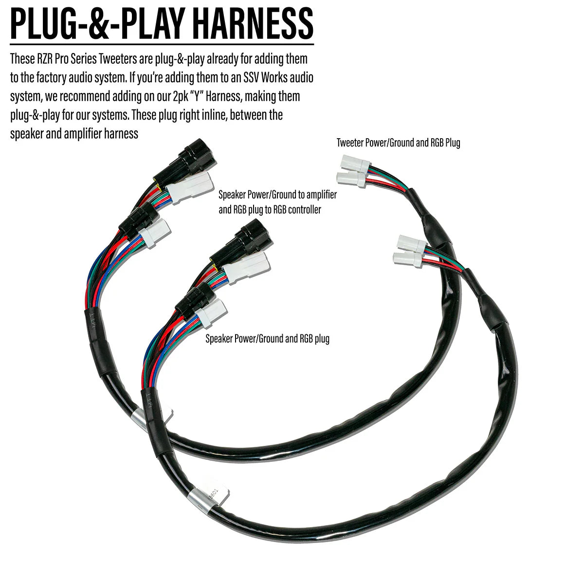 Plug-&-Play: These tweeters effortlessly integrate with the factory RZR Pro Series audio systems, or all SSV Works RZR Pro Audio systems with the add-on "Y" harness which allows for a quick, plug-&-play connection to both the front speaker audio and RGB lighting plugs, ensuring seamless installation. Connectors can be cut off for custom audio systems