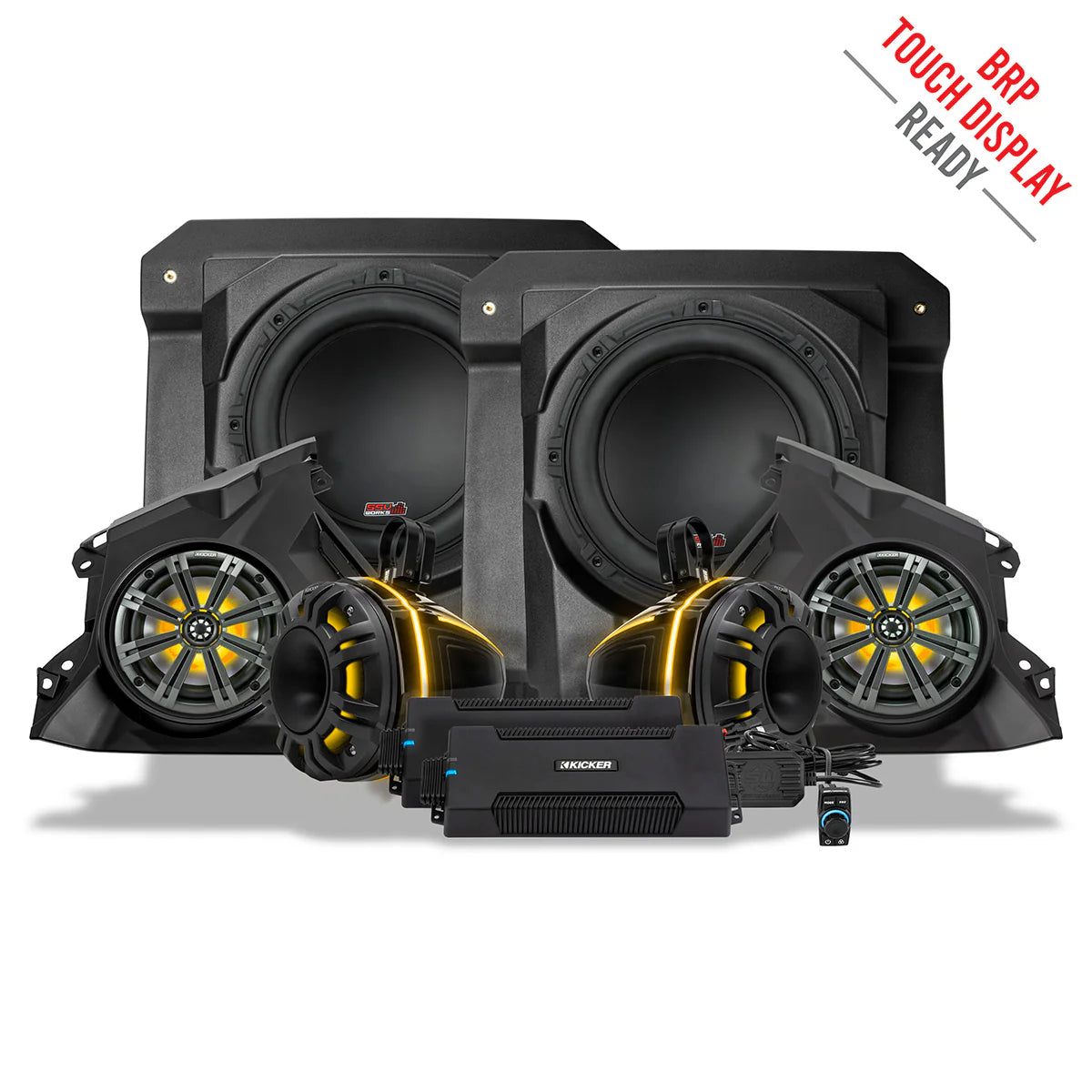 Introducing the SSV Works V-Spec 1650-watt Phase-6 audio-kit designed for the new Can-Am Maverick R! This advanced system enables you to effortlessly install two 6.5" dash speakers, two 6.5" rear horns and two powerful 10" subwoofers along with a set of Kicker Amplifiers that seamlessly integrates with the BPR™ Touch Screen system.