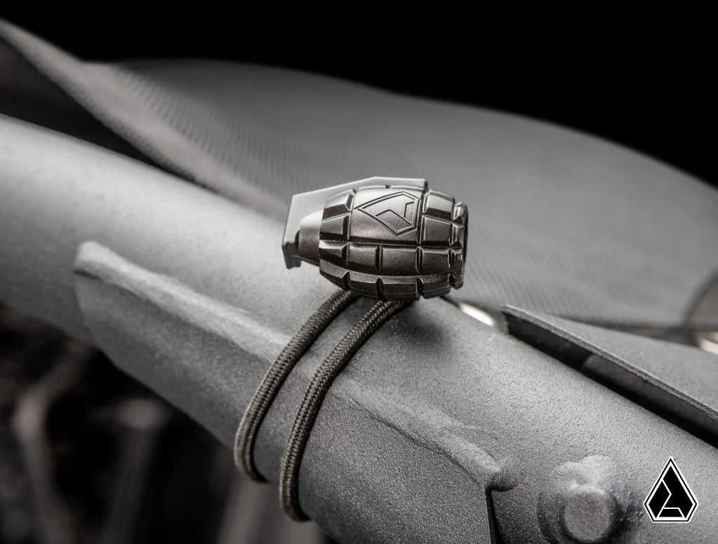 Assault Industries' Can-Am Maverick R shade roof is made with vinyl-coated polyester and uses tie-down bungee cords to keep it tight to your cage. The awesome grenade cord lockers keep it secure even when you’re flying down the trail. Plus, the screen-printed logo gives it the premium finish you expect from Assault Industries.