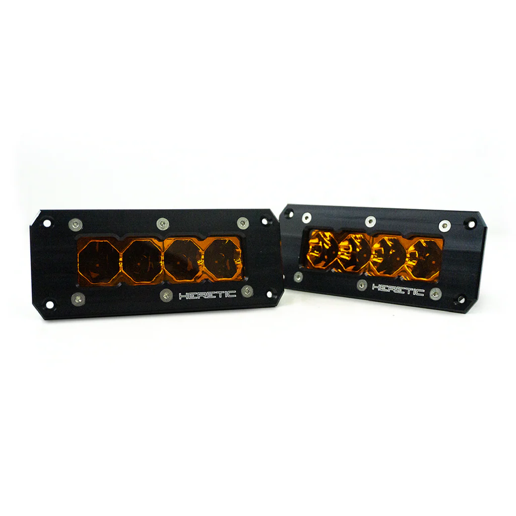 The Heretic BA-4 Flush Mount Amber LED Light Pod is known as the big brother to our staple BA-2 Flush Mount Amber LED Light Pod. They are Designed, Assembled, Supported, and Shipped in Centerville, Utah. The 6-series BA-4 Flush Mount Amber LED pod light is an optimal chase light to a ditch light, A-pillar light and beyond. These high-performance amber LED pod lights are housed in CNC machined aircraft-grade aluminum and outfitted with best-in-class circuit boards that allow temperature control and long-lasting light. The BA-4 Flush Mount Amber LED Light Pod is recommended on the front or rear bumpers of trucks, jeeps, SUVs, and UTVS. They can also be used on the sides and rear of roof racks as a chase light. They are specifically designed to align with the curvature of your vehicle or UTV and are best for cutting through foggy and dusty conditions. Customize your light by choosing the beam pattern, Flood, Spot, Or Combo.