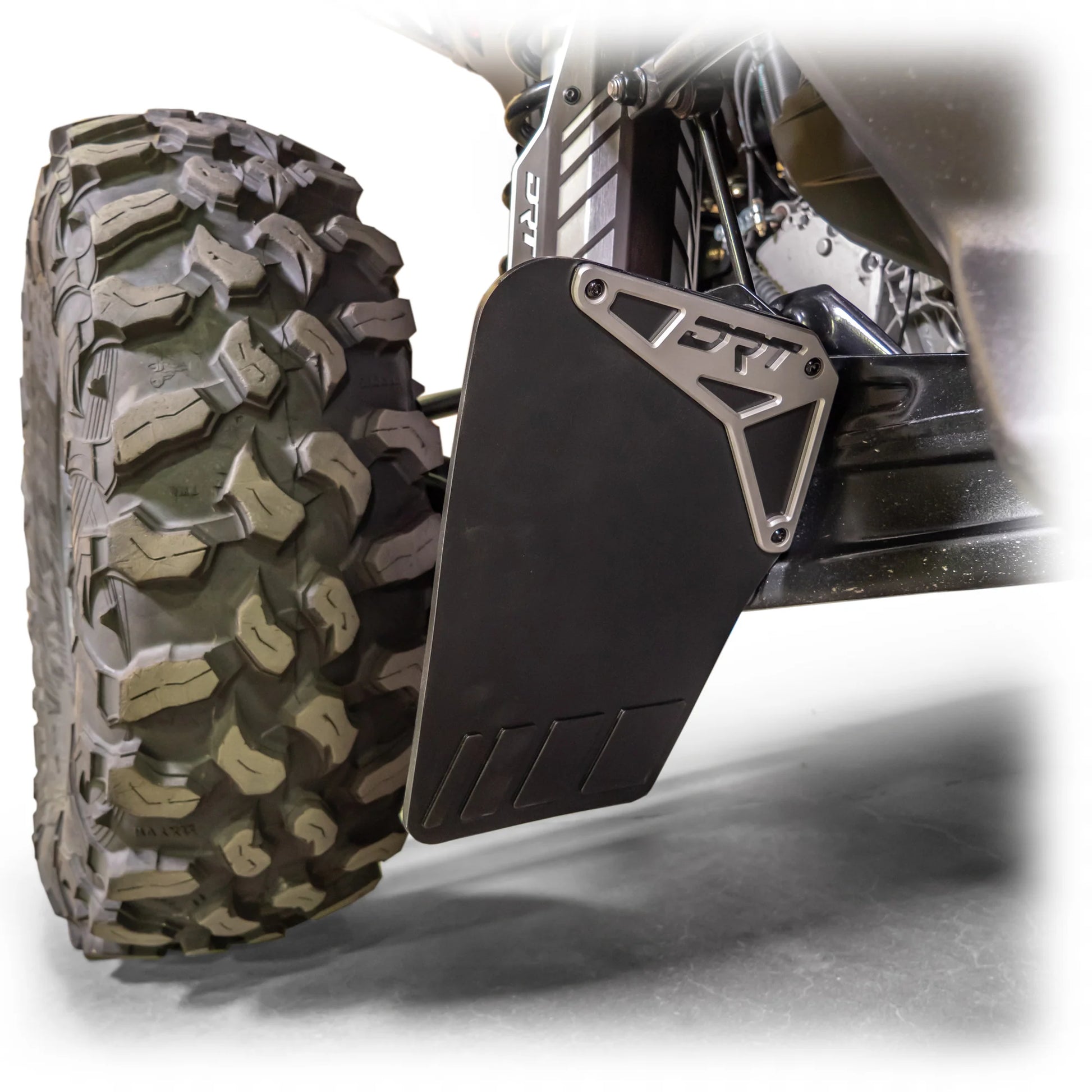 The DRT Billet Aluminum Rock Guard Kit adds protection to the rear of your vehicle by deflecting rocks, dirt, sand, and mud away from vital components. DRT Motorsports Can-Am Maverick X3 Billet Aluminum Rock Guard Kit protects components like brakes, axles, and the finish on your trailing arms, wheels, and link rods.