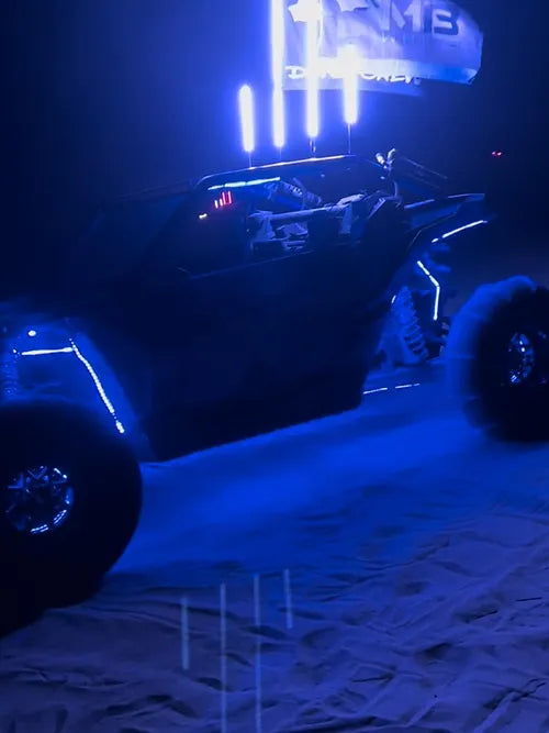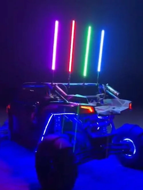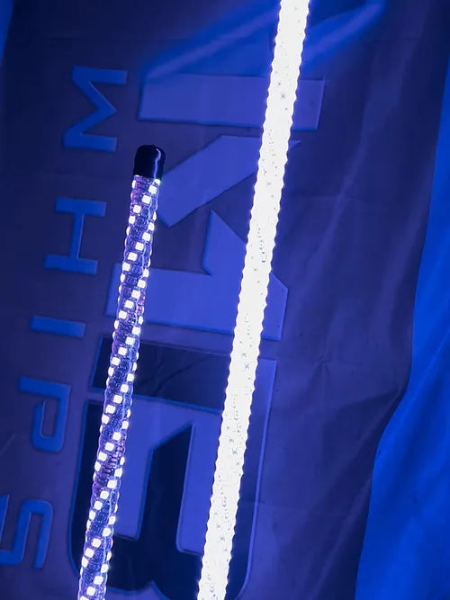 If you are simply looking for the brightest fixed color whip possible, then you’ve come to the right place. The MB Radiant series provides serious LED light output with 600 LEDs per whip on our 42” whip. Those 600 high output LEDs pack some series power and can cast shadows hundreds of yards away. This is the brightest whip we’ve ever made. There’s no doubt you’ll be seen on any trail or dune!